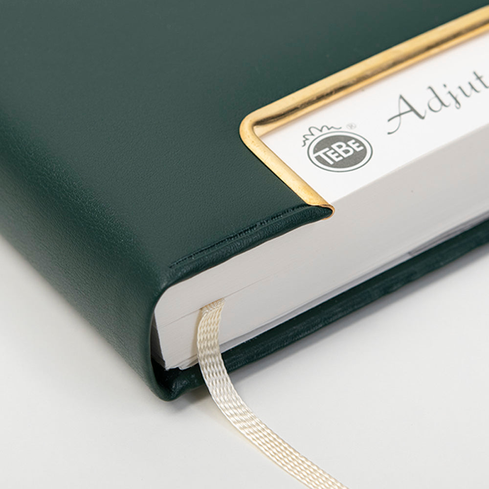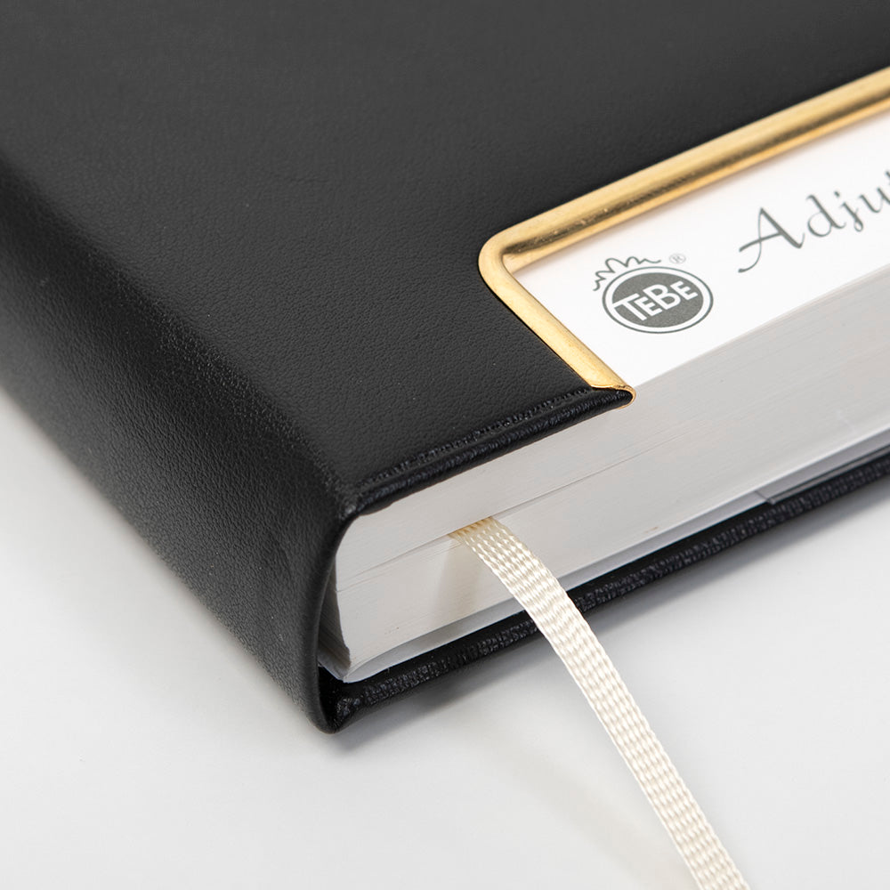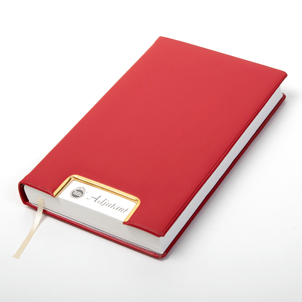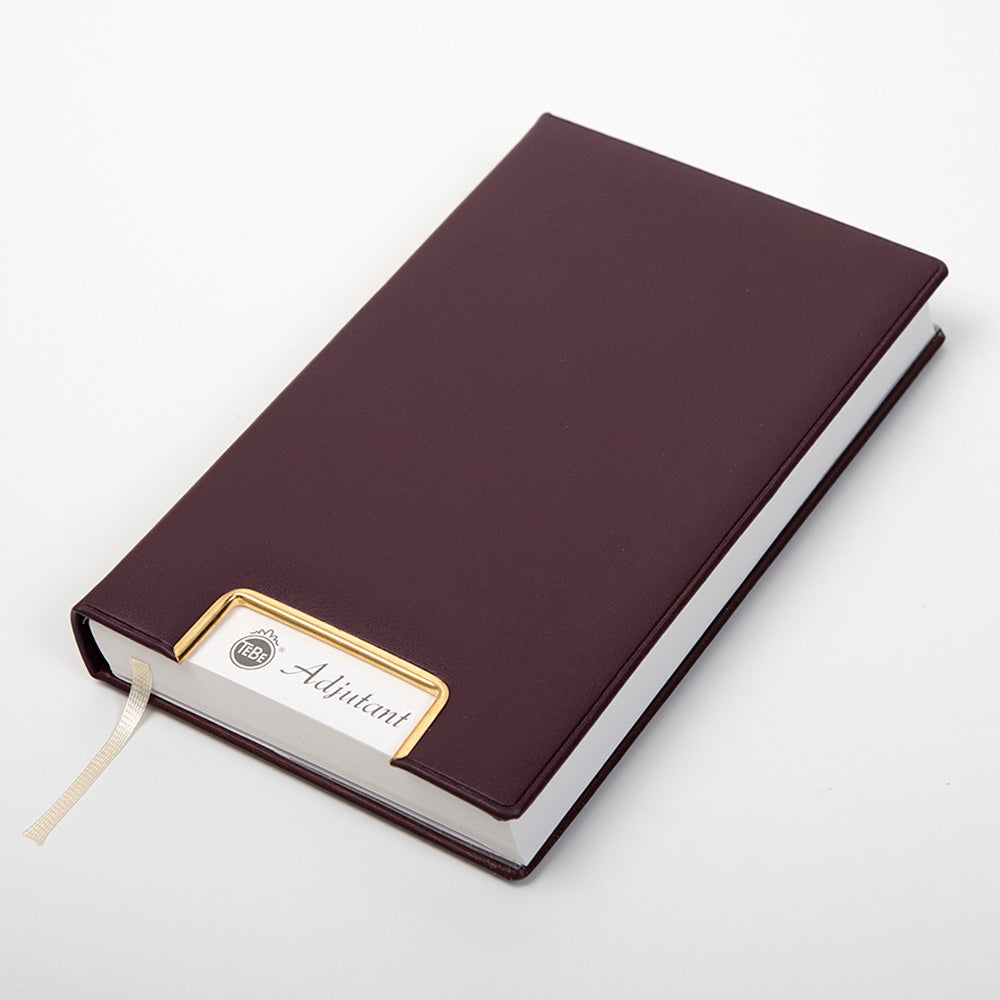 Der untere Rand jeder Seite ist perforiert und abtrennbar. So wird das aktuelle Datum durch die Aussparung in Gold oder Silber auf dem Cover sichtbar und kann direkt aufgeschlagen werden. Die Beschriftungen sind dreisprachig in Deutsch, Englisch und Französisch verfasst. Der hochwertige, handgearbeitete Luxus- oder Kunstledereinband sowie die Fadenheftung sorgen für lange Haltbarkeit. Diese Bindeverfahren zeichnen sich durch außergewöhnliche Verarbeitungsqualität und Güte aus. Je nach Modell ist der Tageskalender Adjutant auch mit einem Gold-, Silber- oder Weißschnitt erhältlich.