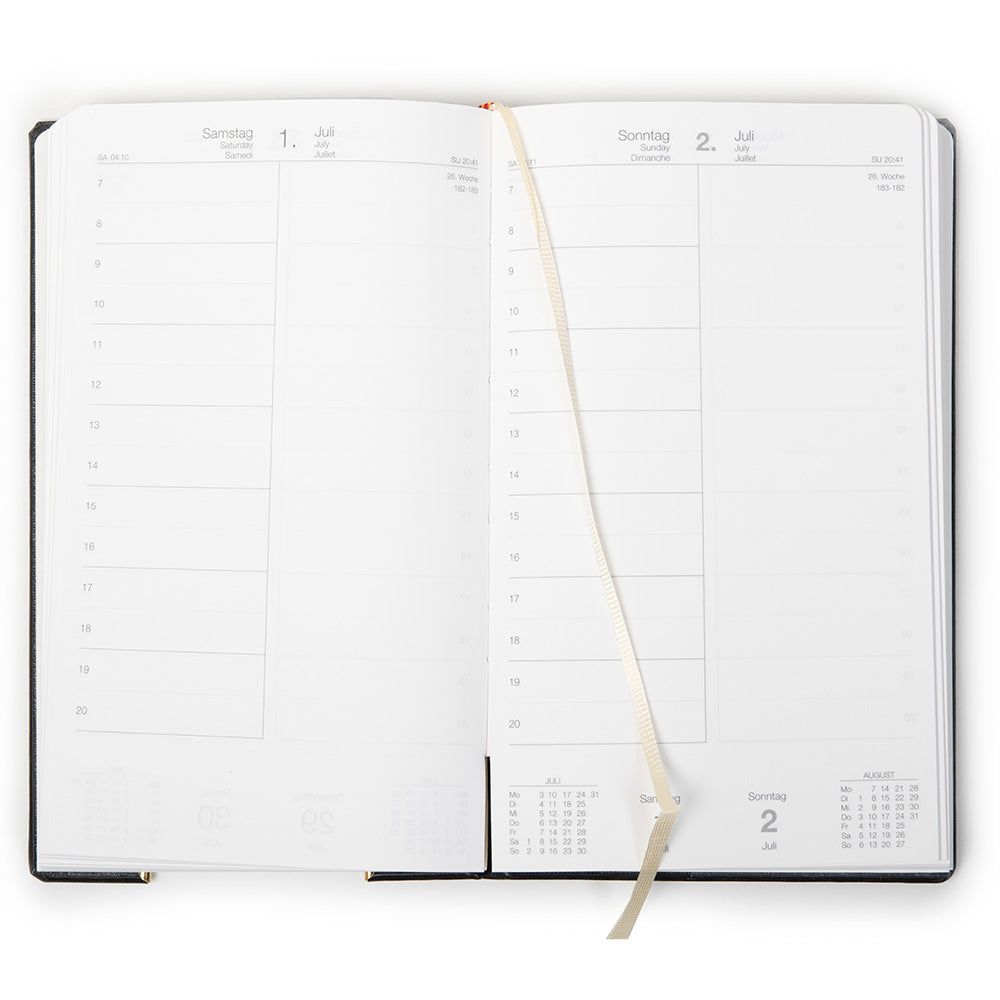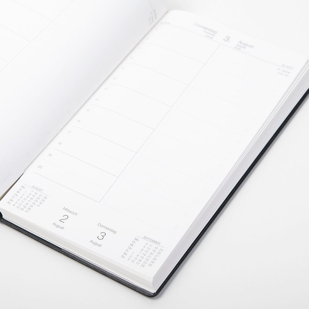 Der Chefkalender Adjutant 2025 gilt als Klassiker von TeBe und wird zum 67. Mal veröffentlicht. Auf 452 Seiten (inkl. Register) aus seidigem Schreibpapier "Regency" wird jeder Tag auf einer Seite dargestellt. Der linke Teil der Seite bietet eine Stundeneinteilung von 7 bis 20 Uhr, während der rechte Teil genügend Platz für Notizen bietet. Kleine Details wie die Angabe der Kalenderwoche, Sonnenaufgangs- und Untergangszeiten sowie eine Miniaturansicht des laufenden und kommenden Monats erleichtern die Planung zusätzlich.